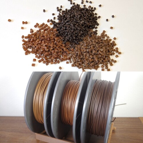 家具の製造時に排出される広葉樹の廃材を回収・粉砕し、樹脂と混錬したウッドペレット / ウッドフィラメントです。 フィラメントは樹脂にもリサイクルPLAを使用し、全体でリサイクル率95%と非常に高い素材となっています。