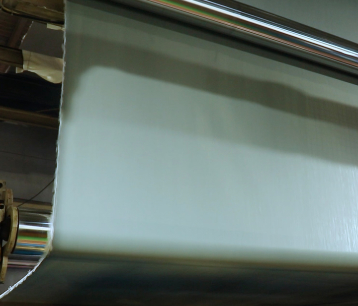 4.フラットヤーンを製織し、生地表裏のラミネート加工に上記再生ペレットを使用し生地化