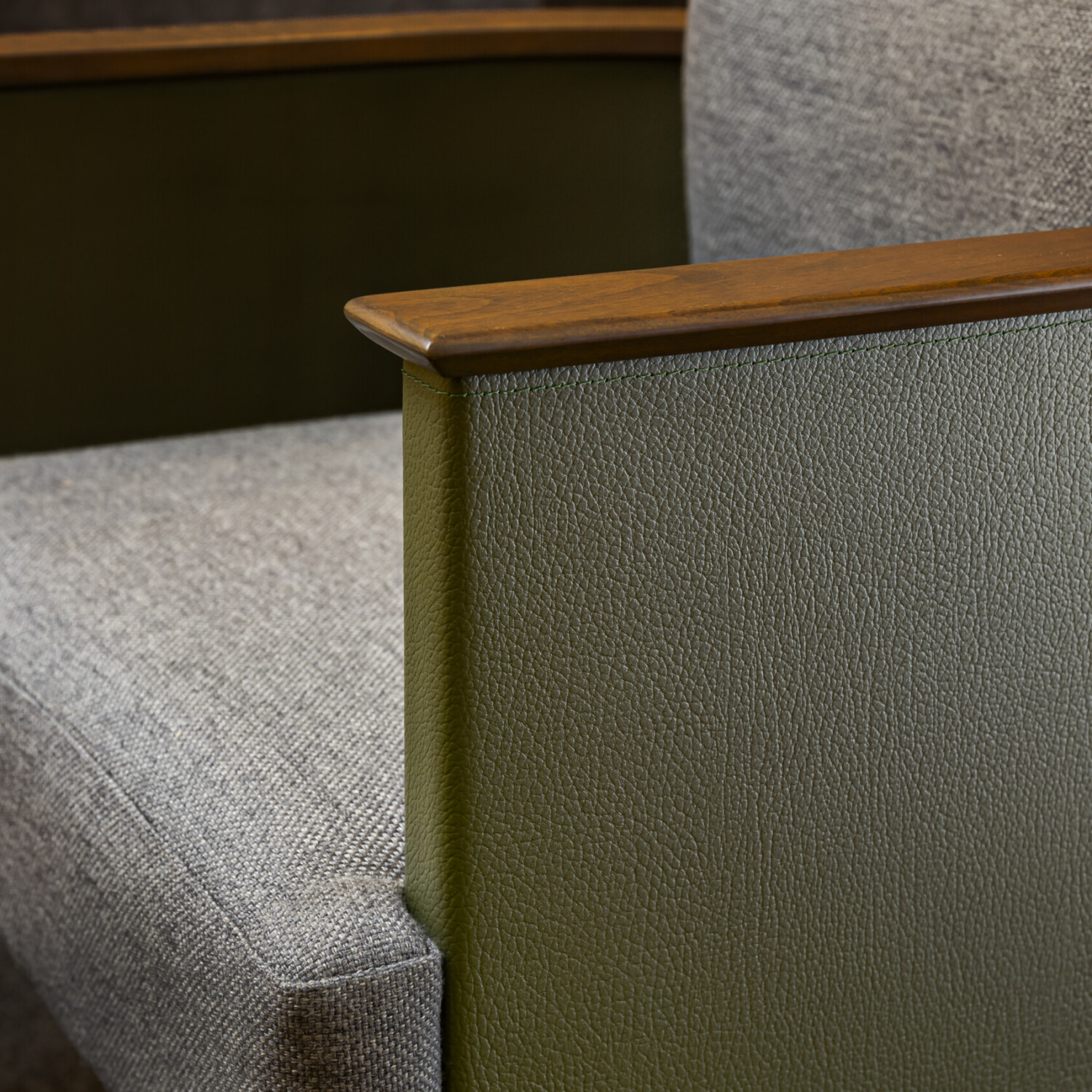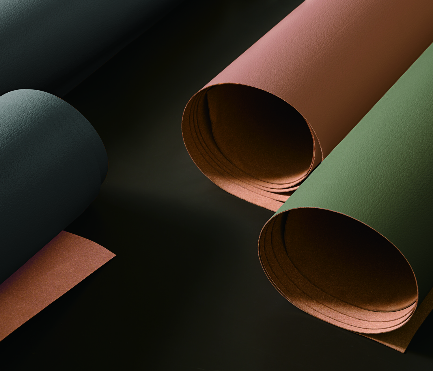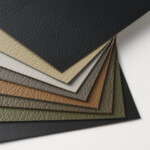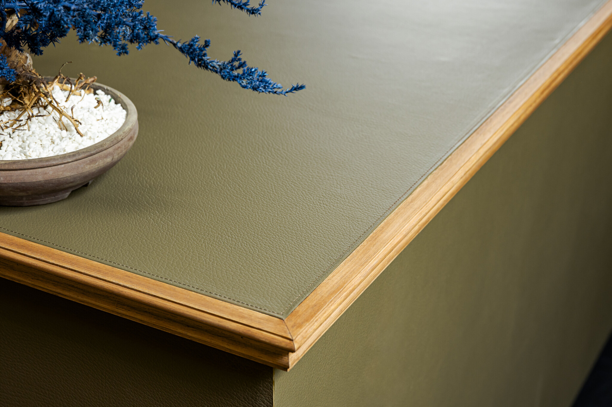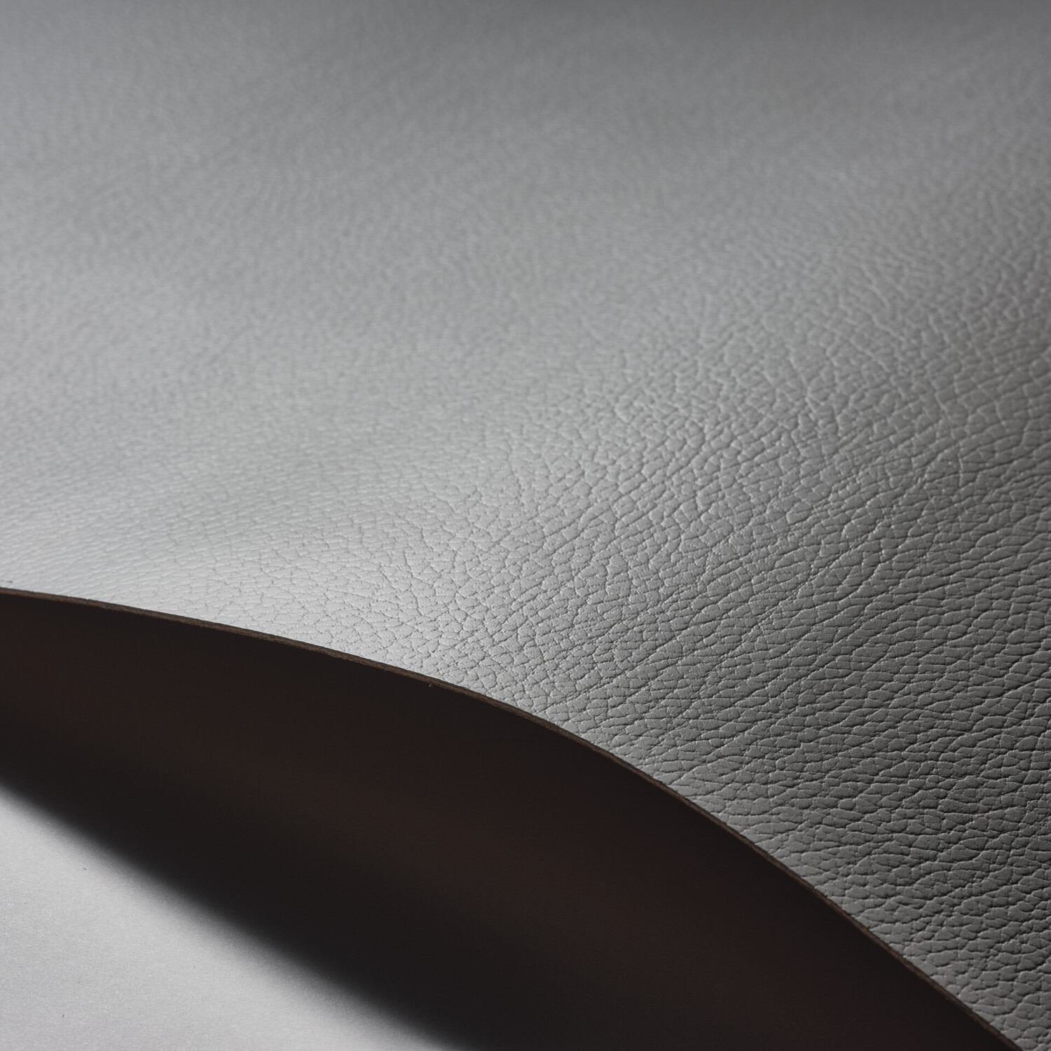 靴やベルトに使用される革の端材を粉砕・再形成した、レザー調の家具表面材です。本革の端材を約60%使用しているため質感も匂いもリアル。長さは2.4m、4.8m、15mから選べ、長尺でも継ぎ目なく貼れるため、これまでにない連続した上質なデザインが可能です。